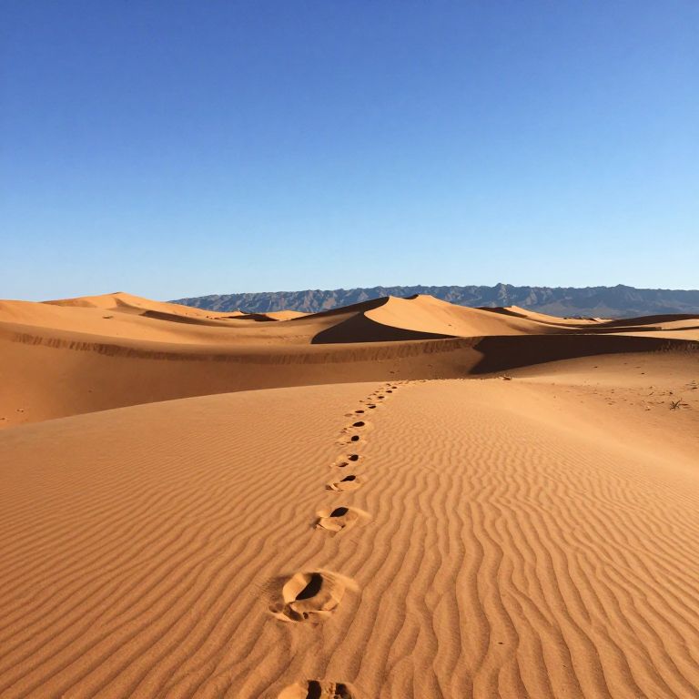 Photograph of a vast desert landscape under a clear, vibrant blue sky. The image showcases undulating, golden-orange sand dunes with distinct, wavy ripples. A single line of animal footprints extends from the foreground to the mid-ground, adding a sense of scale and direction. The horizon features a distant, dark mountain range, contrasting with the bright sand. The lighting casts gentle shadows, enhancing the texture of the sand and the contours of the dunes. The overall scene is serene and expansive, highlighting the natural beauty of the desert environment.
