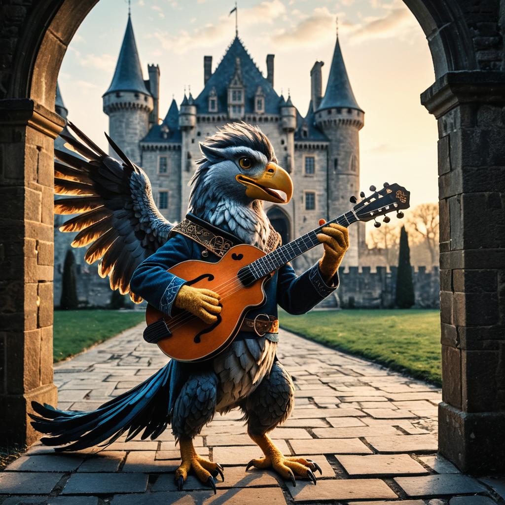 A detailed and expressive digital art image of a griffin standing in a castle courtyard at dawn. The griffin is anthropomorphic, wearing a blue ornate jacket, and is playing a mandolin. The background features a medieval stone castle with towers and turrets under a soft morning sky, creating a romantic and fantastical atmosphere.