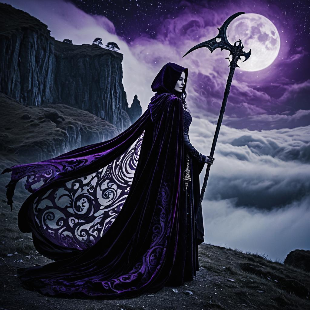 Mystical Woman in Purple Gothic Cloak with Scythe