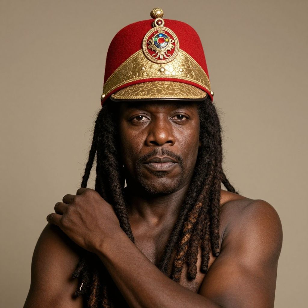 A man with dreadlocks is wearing a red and gold hat with a decorative emblem on it. He has a strong, rugged appearance with a confident posture, embodying the spirit of the era. His dreadlocks are thick and well-groomed, adding to his distinctive look. The red and gold hat is prominently displayed, featuring a detailed emblem that adds a touch of tradition and authority. The overall image captures his bold presence and the vibrant colors of the hat, creating a striking visual.