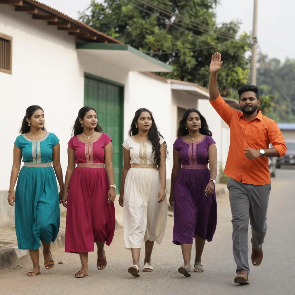 Five people in a street scene. Four women in colorful dresses, one man in an orange shirt and gray pants. Man runs to the right, arm raised. Women walk, looking ahead. Background: white building, green door, trees, power lines.