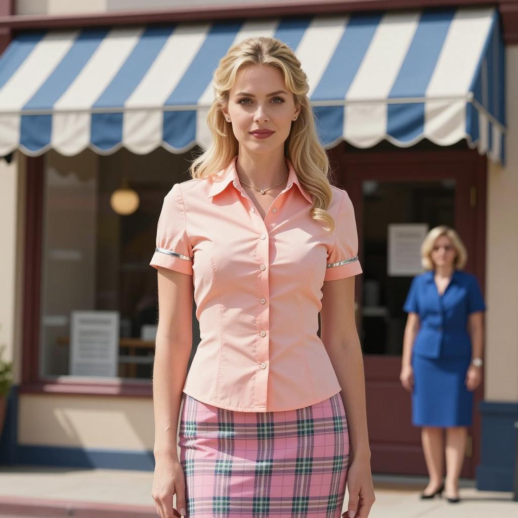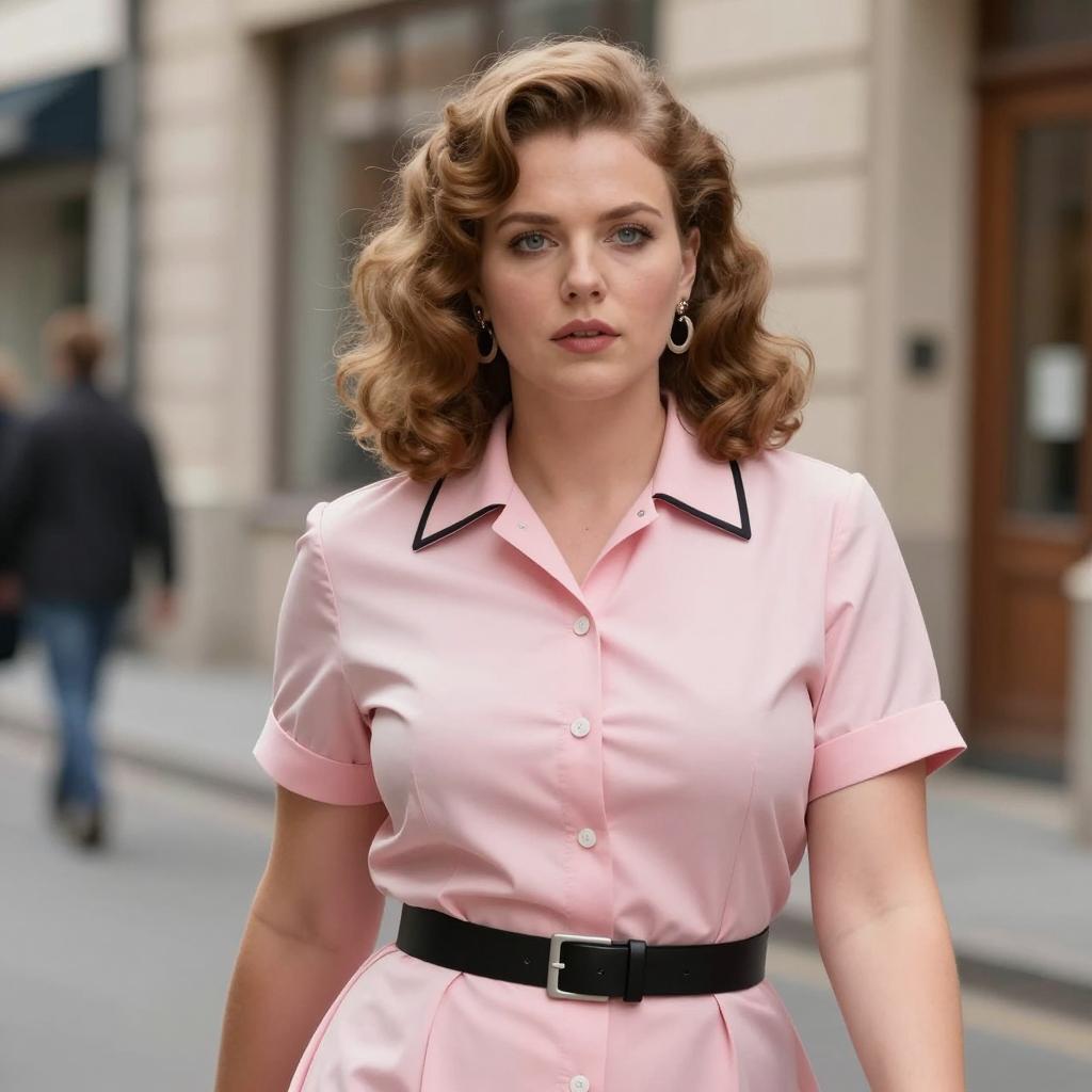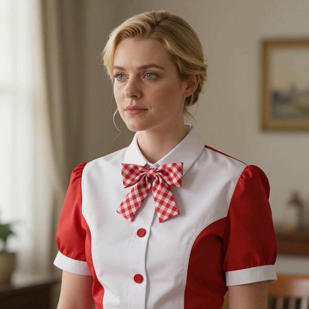 Portrait of a young fair-skinned woman with blonde curly hair styled with a large red bow. She is wearing a vintage 1950s style red dress with white polka dots, white puffed sleeves, a white ruffled collar, and a black waist belt. The background shows a blurred exterior of a house in daylight with slightly warm lighting. The woman has a serious expression and stands facing the camera with a retro aesthetic.
