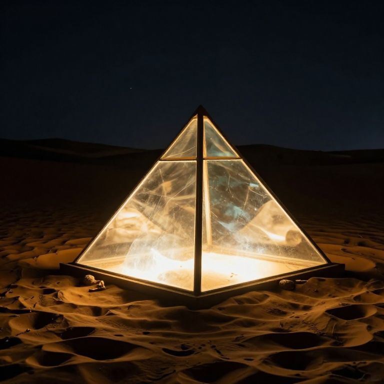 In the quiet embrace of the desert night, a luminous glass pyramid emerges like a beacon of transient hope, casting a warm glow that dances upon the undulating sands, evoking a sense of wonder and the ephemeral beauty of existence.