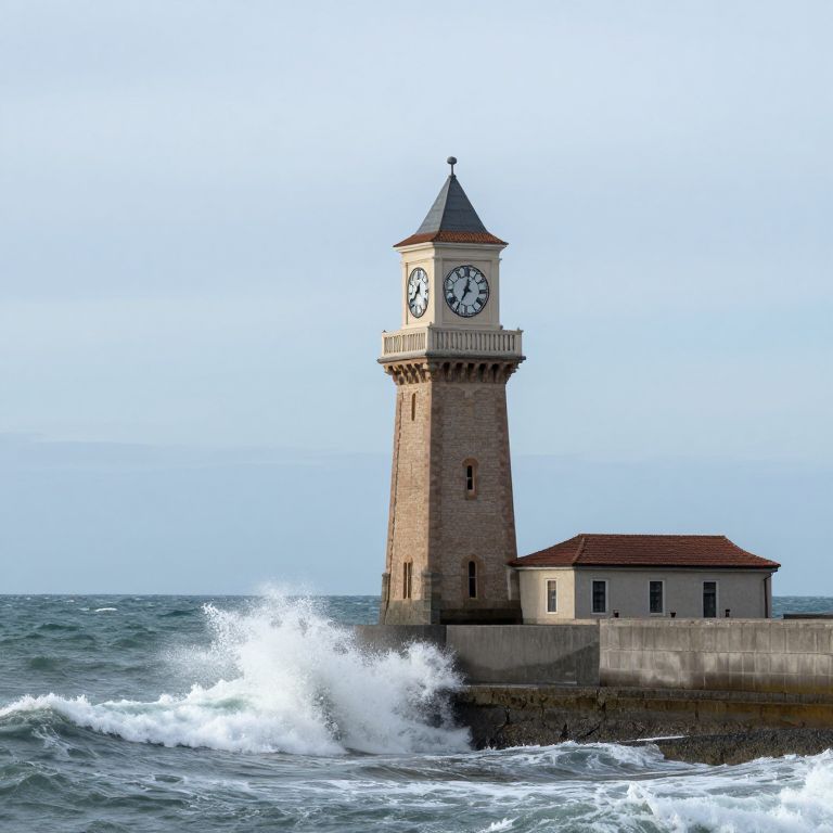 Perched precariously above the restless sea, the ancient clocktower stands as a sentinel of time, its unwavering presence a paradox of serenity and eternal vigilance, while the ceaseless waves below whisper tales of transience and the unyielding march of existence.