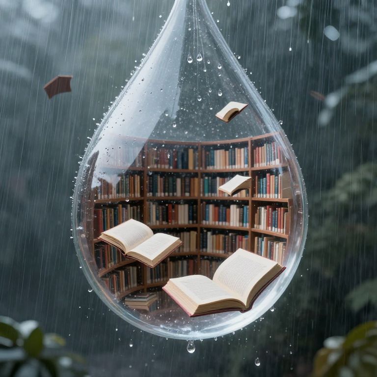 A translucent library floats inside a giant raindrop, where every book falls gently as raindrops when opened.