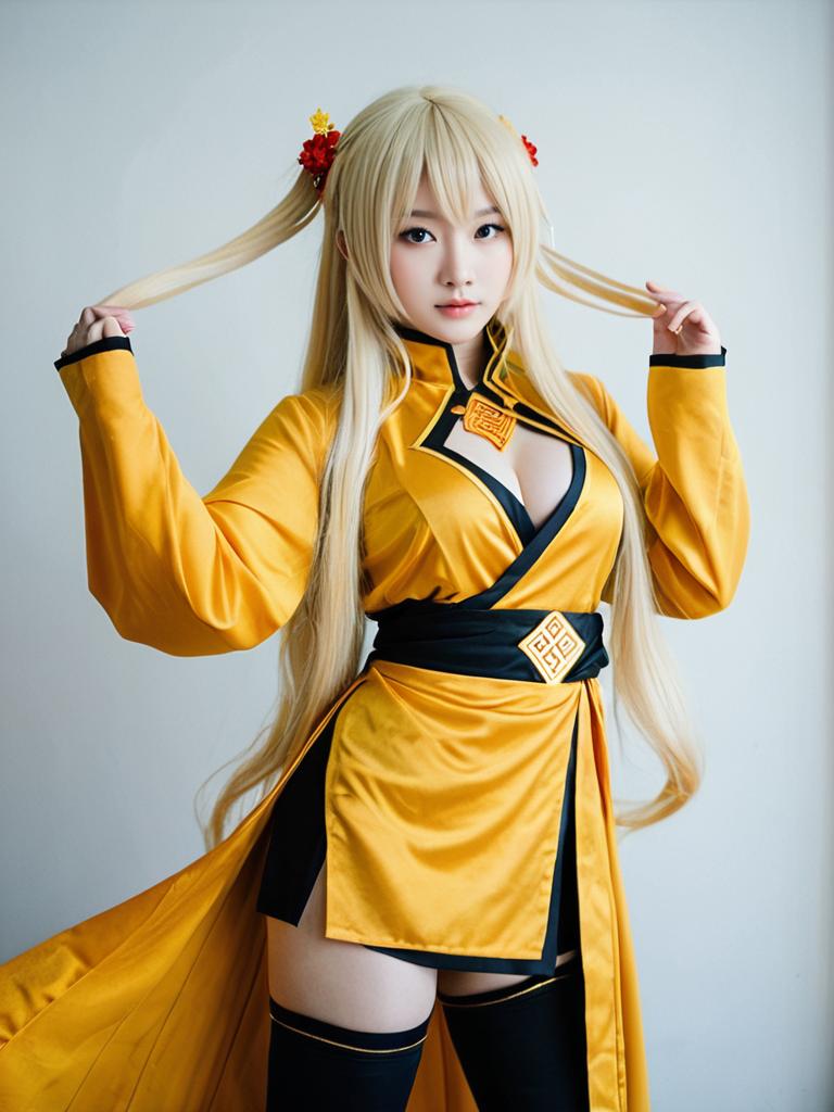 Asian woman dressed as Yang Xiao Long from the animated series RWBY. She wears a detailed yellow and black cosplay outfit with long blonde hair styled in twin pigtails adorned with red and yellow flower decorations. The costume features a high slit skirt and thigh-high black stockings. Posed against a plain light background.