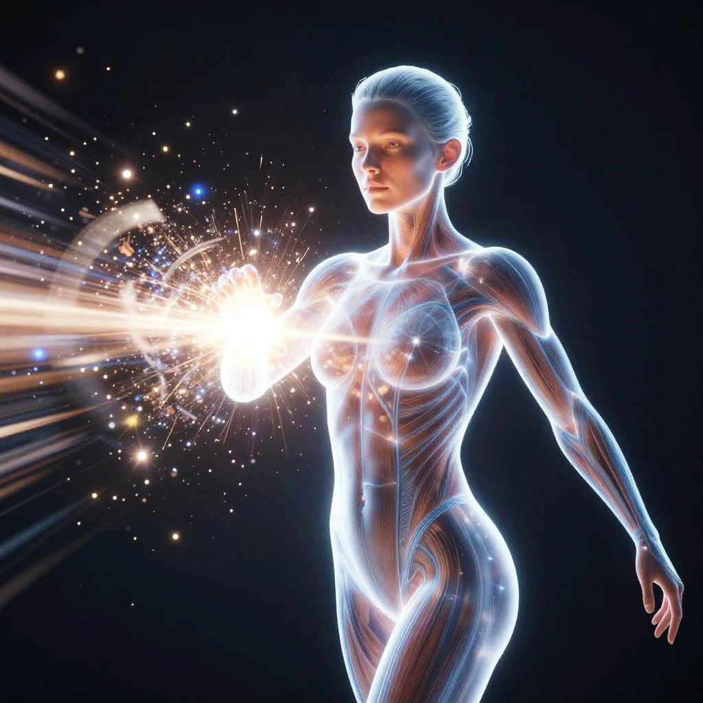 Ghostly female, glowing from within as radiant plasma passes through her, at the moment of molecular fragmentation, irradiated isotopes coming apart, glowing motion blur, translucent layered skin revealing vascular channels