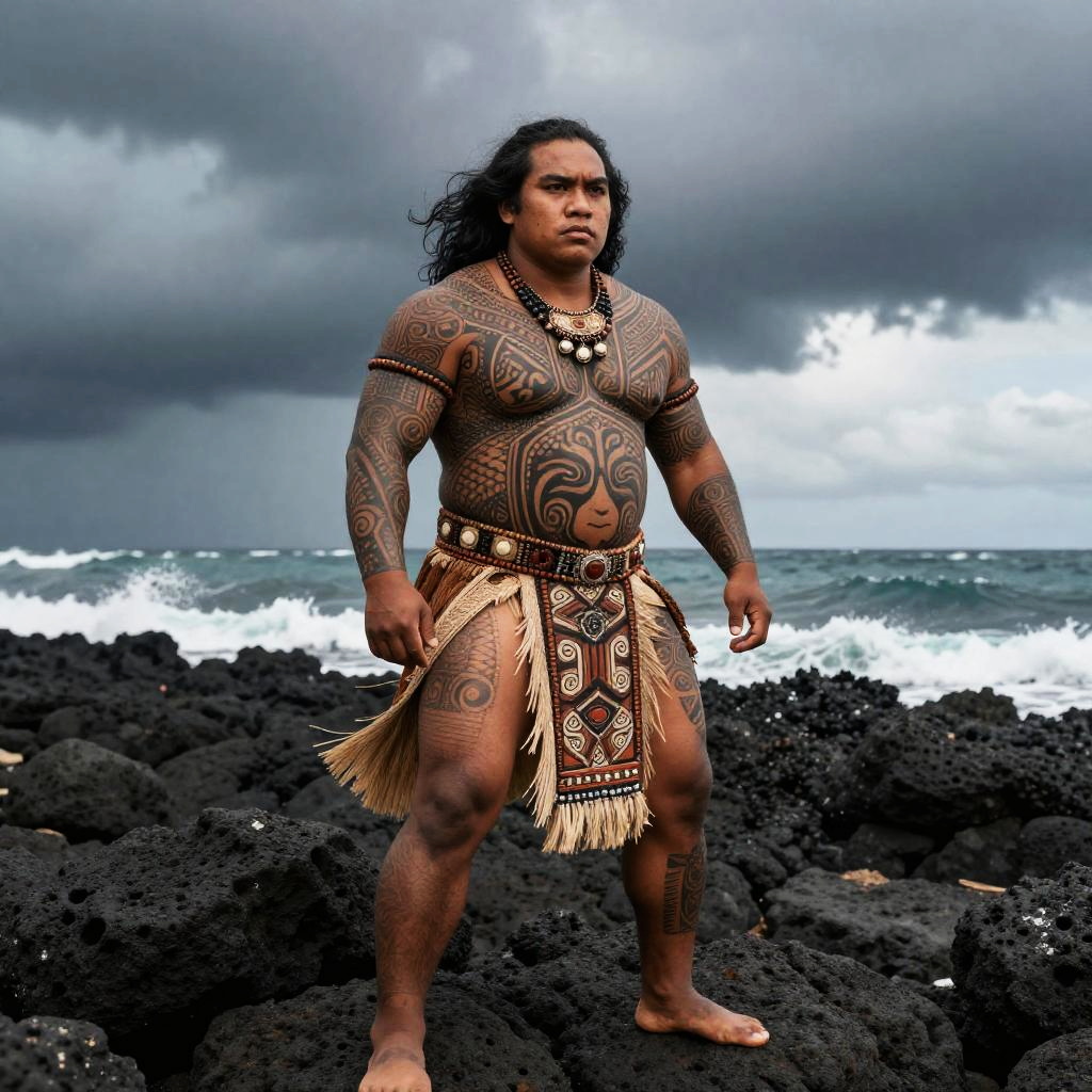 Samoano warrior in detailed traditional tattoo patterns and ceremonial dress, standing on rugged volcanic rocks by the sea, dramatic stormy clouds above, intense facial expression, dynamic lighting highlighting body art and Polynesian heritage.
