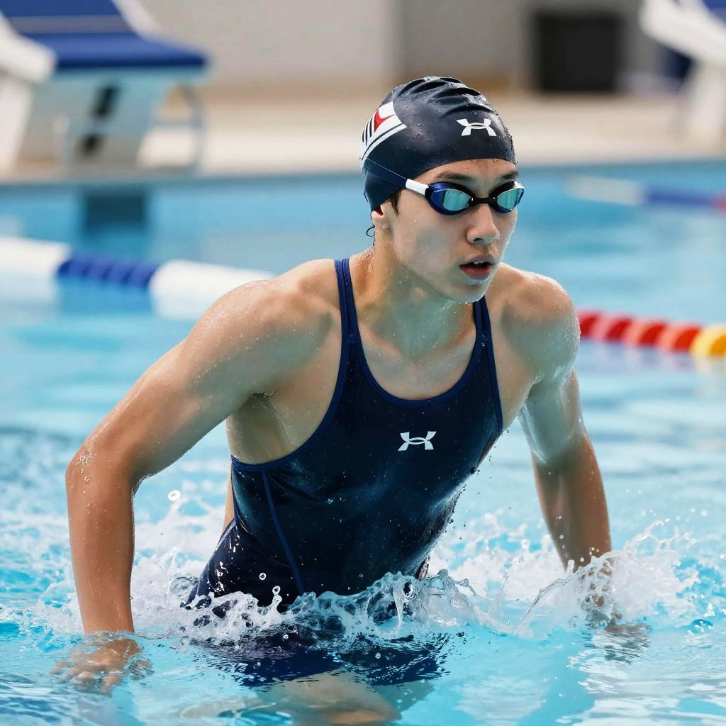 Photograph of an Asian male swimmer with a lean build, wearing a black swim cap, black Under Armour one-piece swimsuit, and dark sunglasses. He is in a pool, emerging from the water with a focused expression. Water splashes around his arms as he moves. The background features blurred pool lanes, a red and white lane divider, and a white and blue poolside chair. The pool water is a clear blue, with bright, natural lighting highlighting the swimmer's determined look and wet skin.