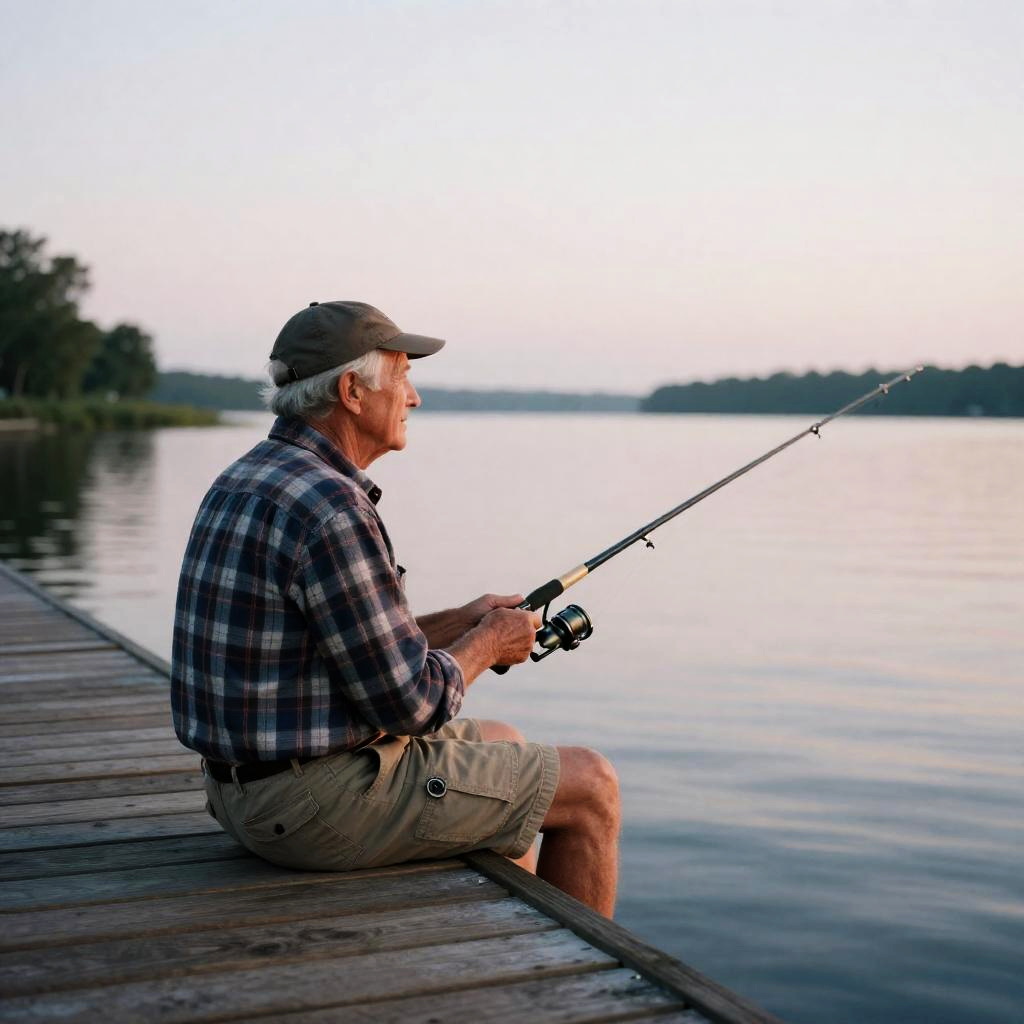 Realistic photo.Kodak Portra cinematic film still of an elderly man fishing, dressed in a plaid shirt and cargo shorts, sitting on a wooden dock at dawn, peaceful and reflective vibe. realistic photo