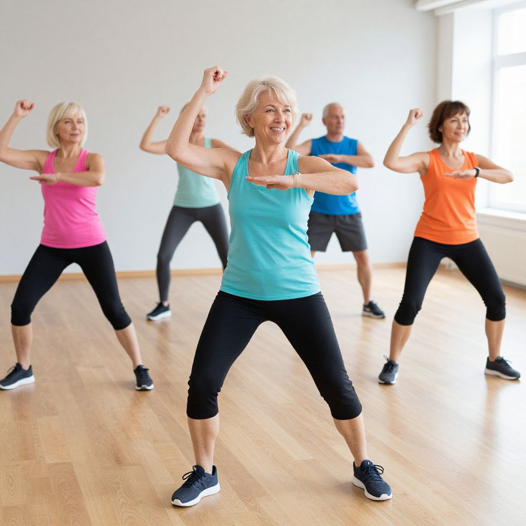 Smiling woman leading an active aging fitness class, surrounded by three participants in athletic attire, all engaged in synchronized movements within a bright, modern studio setting.