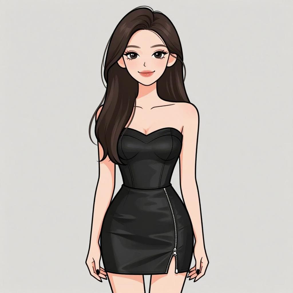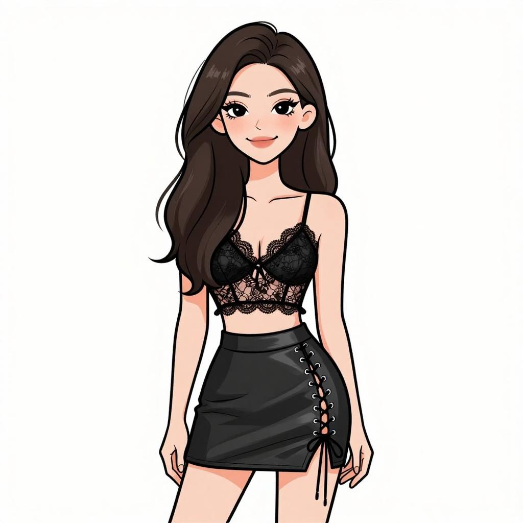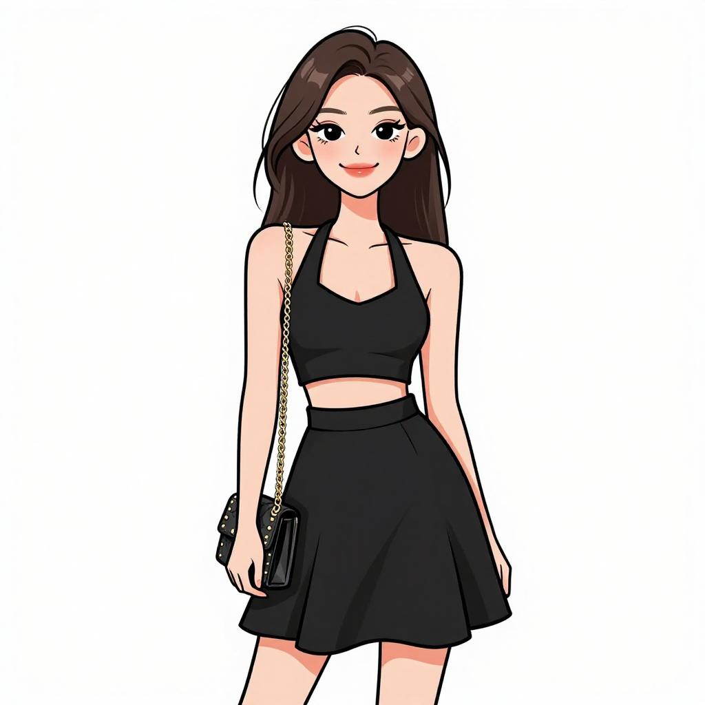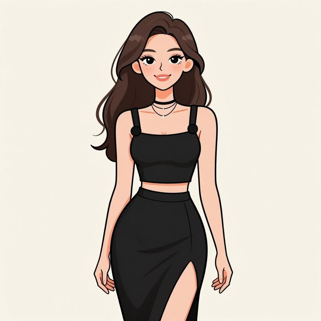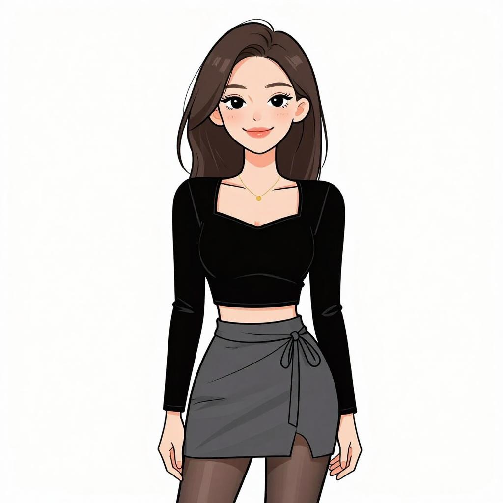 Woman with pretty face and pretty hair. smiling Woman, luxe winter chic, black velvet two-piece set, cropped bustier top, matching high-waisted mini skirt, oversized faux fur coat, knee-high suede boots in black, simple makeup, straight long hair, white studio background --sref 1467