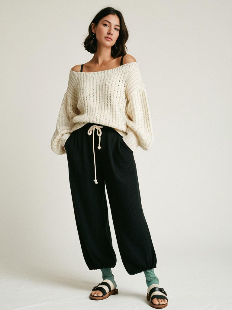 Woman, casual comfort, cream knitted sweater with balloon sleeves, cinched cuff details, wide-neck, black wide-leg drawstring pants, mint-colored sock peeking out, strappy sandals in earth tones with buckle detailing, white studio background. --sref 1390