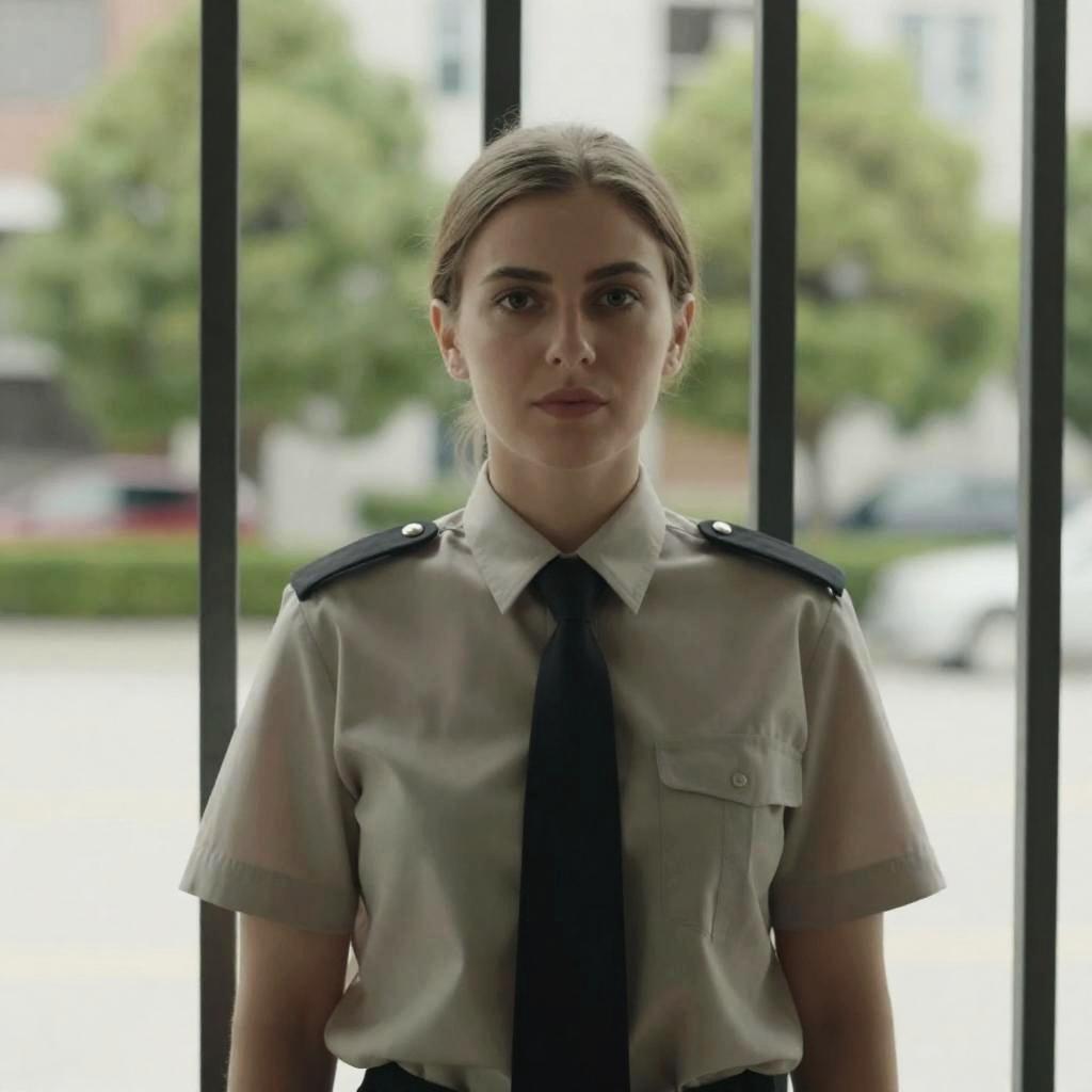 Photograph of a woman with light brown hair in a beige uniform with a black necktie, standing behind metal bars. Green trees, parked cars, and white buildings in the background. Neutral facial expression. Vertical metal bars in foreground.