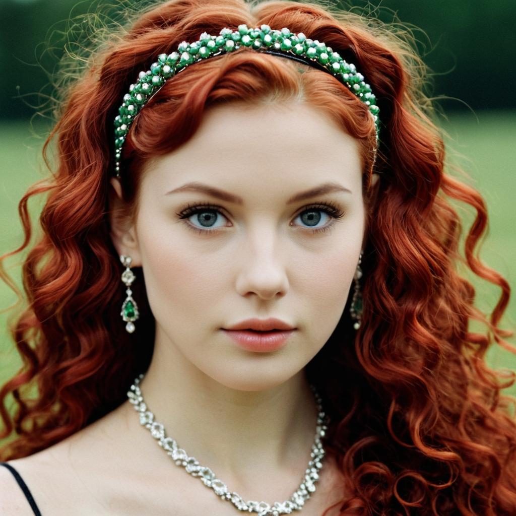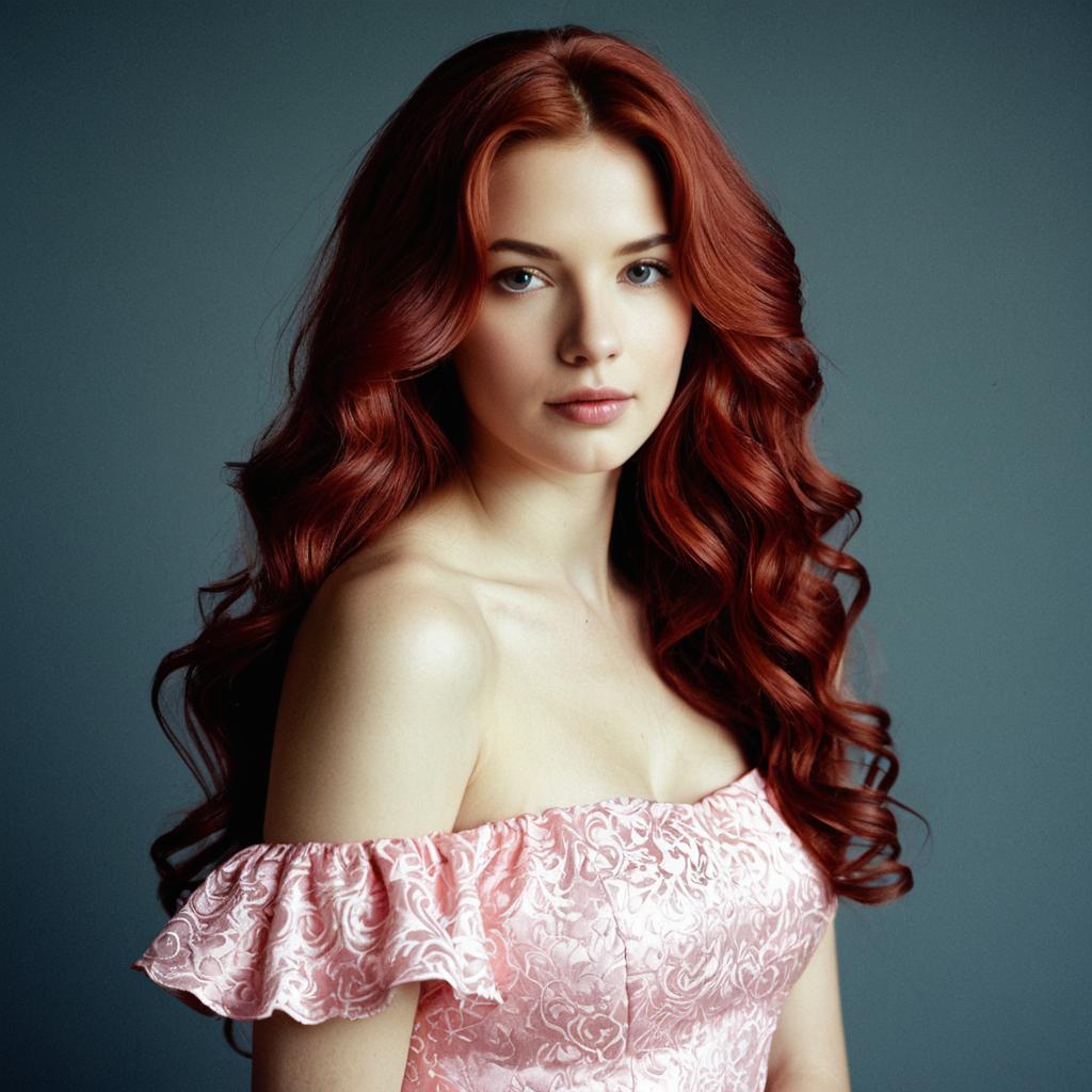 Turning red costume,1girl, solo, dress, red dress, flower, hair flower, jewelry, earrings, hair ornament, red hair, long hair, looking at viewer, realistic, grey background