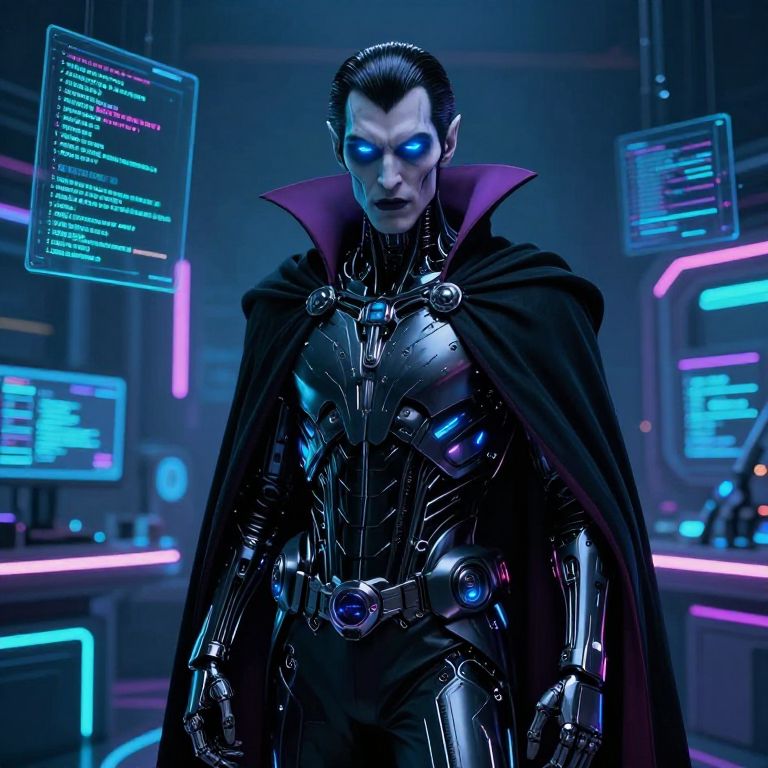 A vampire AI prompt: a sleek, cybernetic vampire with glowing blue eyes and a futuristic cloak, standing in a neon-lit digital lab, surrounded by floating code and holographic data streams, blending ancient lore with cutting-edge artificial intelligence.