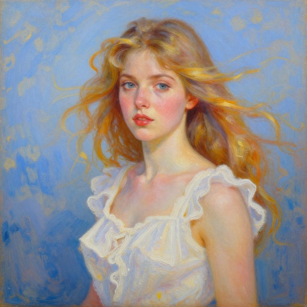 A vibrant impressionist-style oil painting captures a radiant young woman with flowing golden hair, wearing a delicate white ruffled top, set against a serene blue background with subtle texture and warm lighting effects.