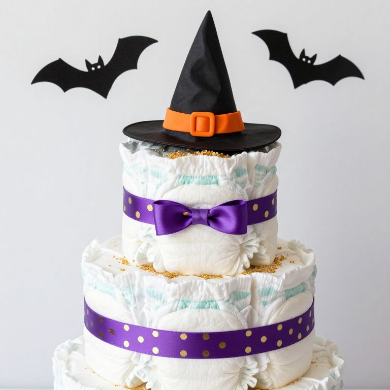 Tiered Witch-Themed Diaper Cake crafted with white diapers, adorned with purple ribbons featuring gold polka dots, topped by a black witch hat with an orange band, and decorated with golden sand-like sprinkles, complemented by two silhouetted bats flying to the left and right.