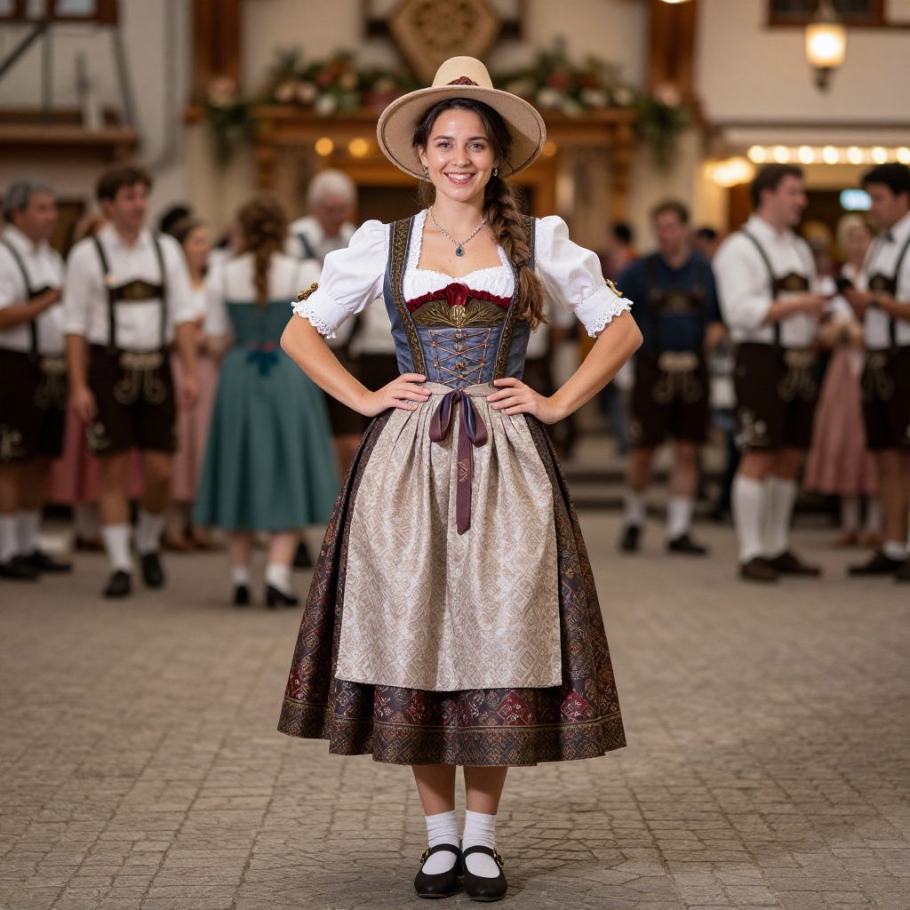 Oktoberfest Long Dress Costume, woman in traditional dress and hat posing for a picture