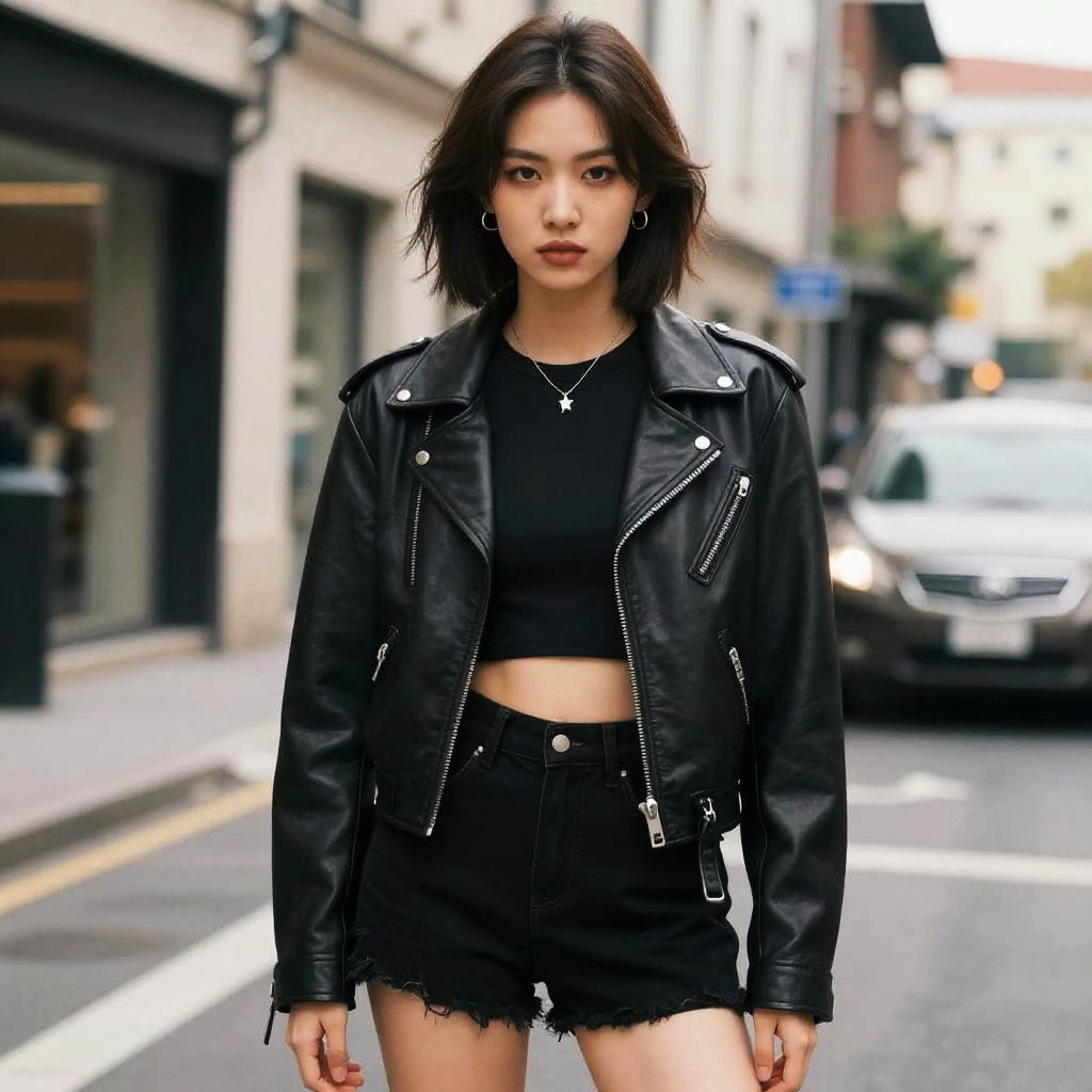 Photograph of an Asian woman with shoulder-length black hair, wearing a black leather jacket, crop top, and high-waisted denim shorts, standing