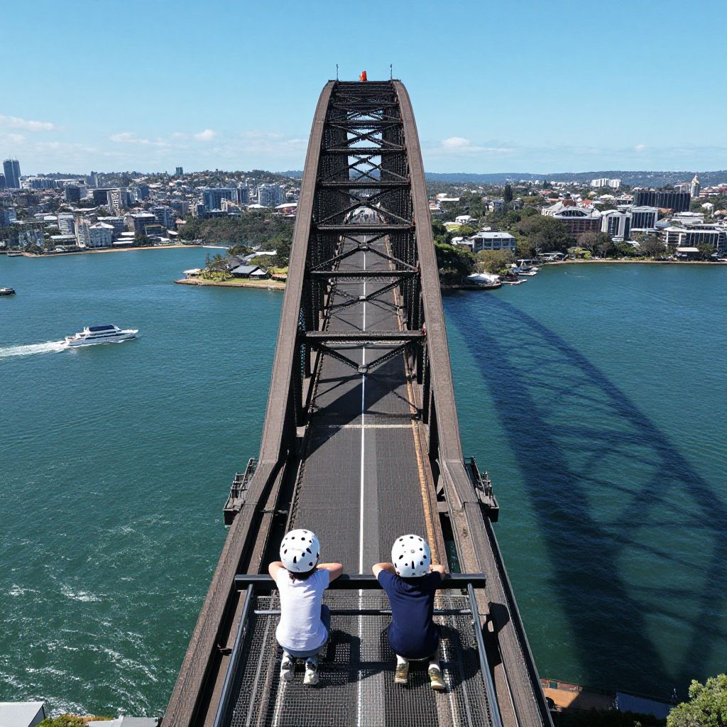 Aerial drone shot of the Sydney Harbour Bridge spanning the harbour in mid-day, with clear blue skies and boats moving in the water below. A family with two children in helmets is seen on the bridge’s central section, leaning toward the view of the harbour and the nearby towers.