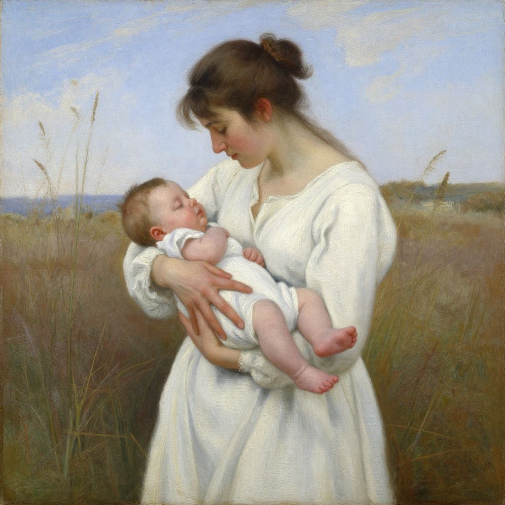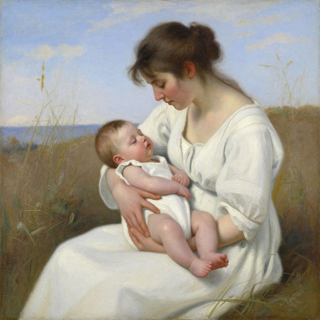 This is a digital painting in a realist style depicting a young woman with fair skin and dark brown hair in a bun, wearing a white, long-sleeved dress, gently holding a baby. The baby, also with fair skin, has short, light brown hair and is dressed in a white onesie. The woman looks down at the baby with a tender expression. They are standing in a field with tall, dry grass and a blue sky in the background. The woman's hands cradle the baby securely, and the baby's feet are slightly bent. The overall composition is soft and serene, emphasizing a sense of maternal love and tranquility.