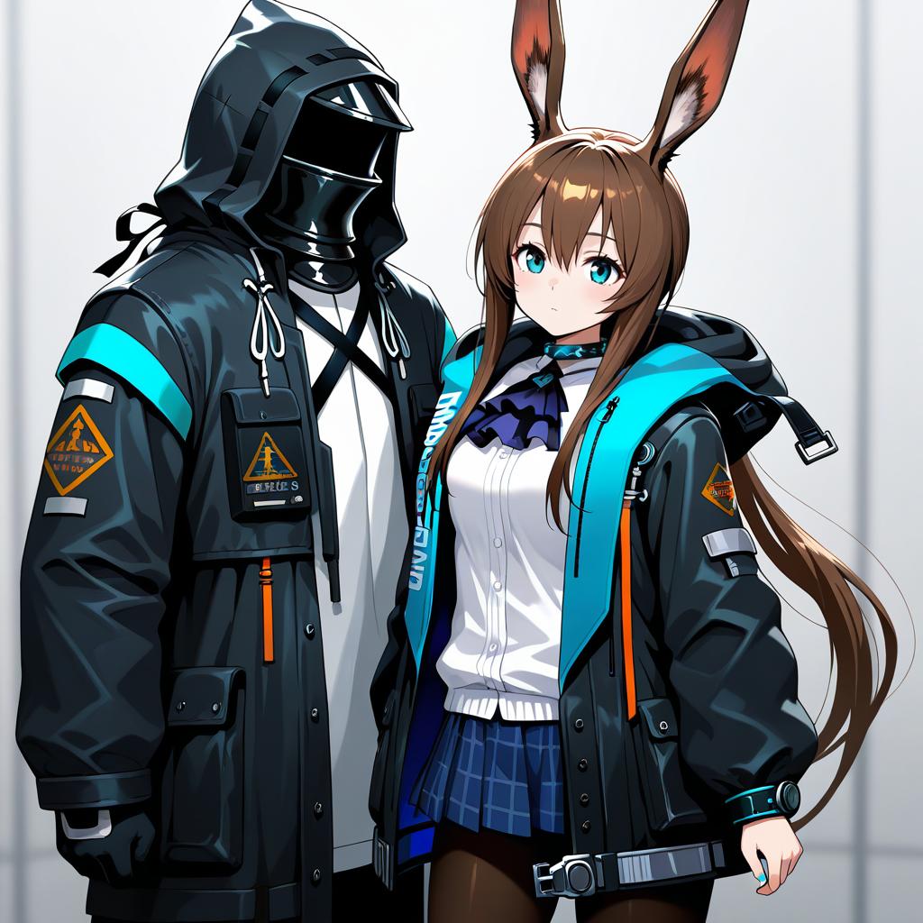 Digital illustration featuring two characters from Arknights: Amiya, a rabbit-eared girl with long brown hair, blue eyes, wearing a black and blue hooded jacket, white shirt, blue skirt, and black pantyhose; accompanied by a faceless figure in a black hooded jacket with blue accents and a black mask. Both characters wear detailed, modern-style outerwear with futuristic design elements.