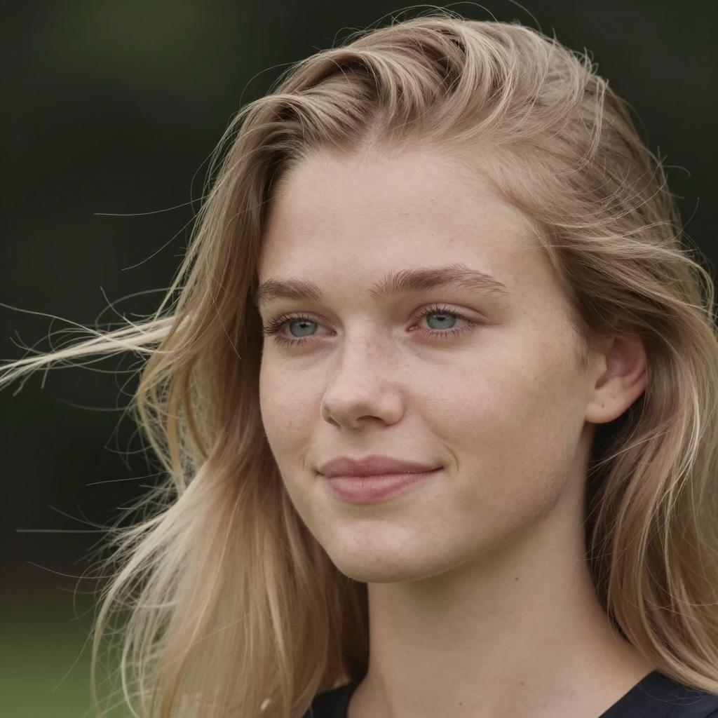 Close-up photograph of a young woman with light blonde, windswept hair, fair skin, and blue eyes. She has a slight smile, light freckles across her cheeks, and a few small blemishes on her face. The background is dark and out of focus. Her hair is messy, with strands flying to the left. She is looking slightly to the right with a calm expression. The lighting highlights her hair and face.