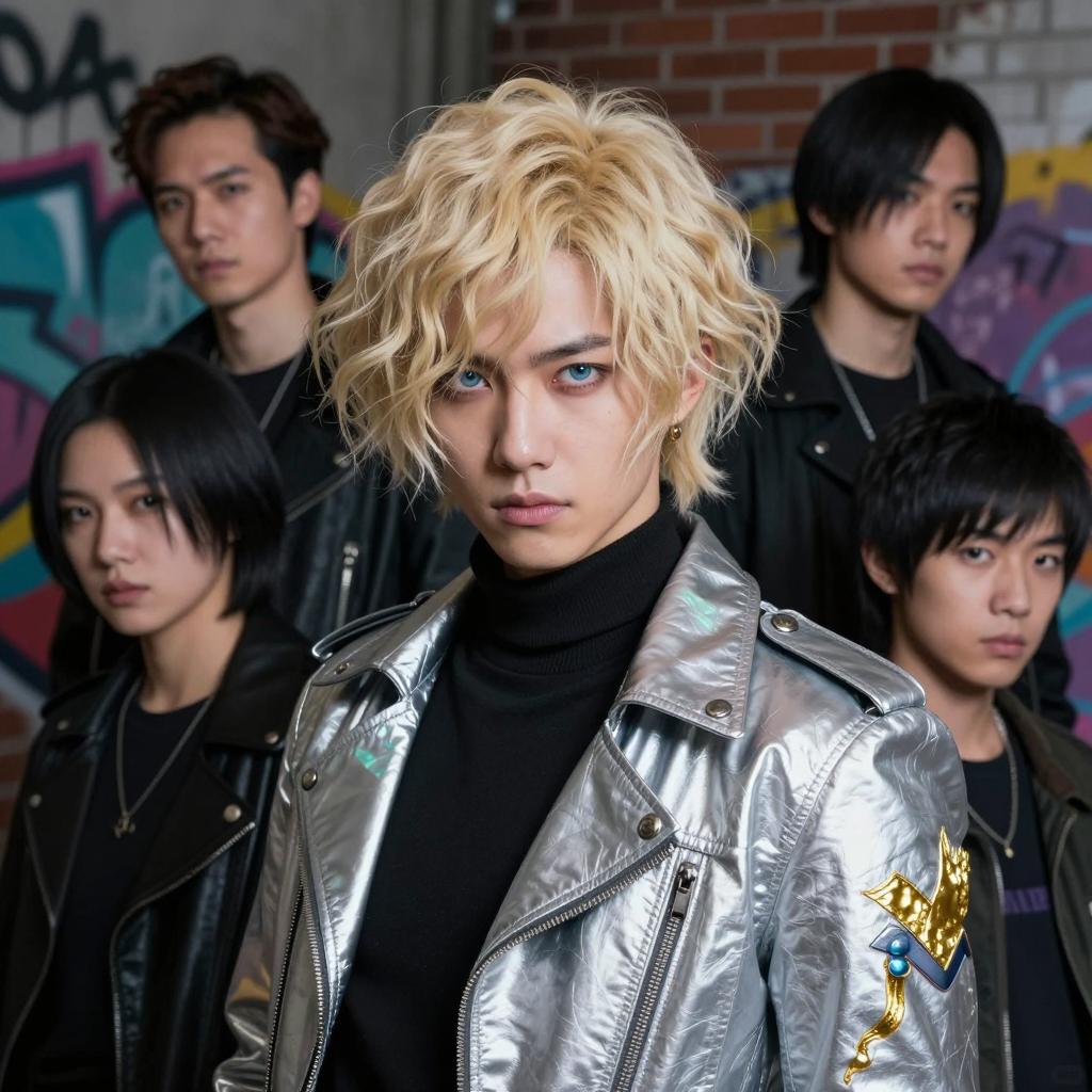 Hyper-realistic portrait of a young man with nails and screws tangled in his hair, displaying bruises and a somber expression. Two blurred figures with dark makeup stand behind him against a dark, moody background. The image features dramatic lighting, intricate details, and a strong sense of surrealism and tragic emotion.