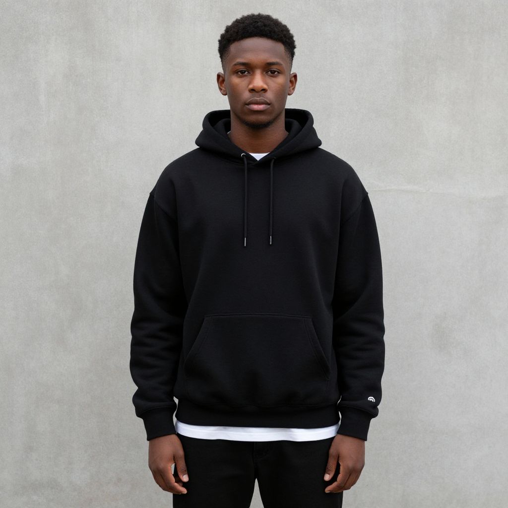 "Installation Art 2049 Streetwear outfit, plain black hoodie, instagram style, young black male model,"