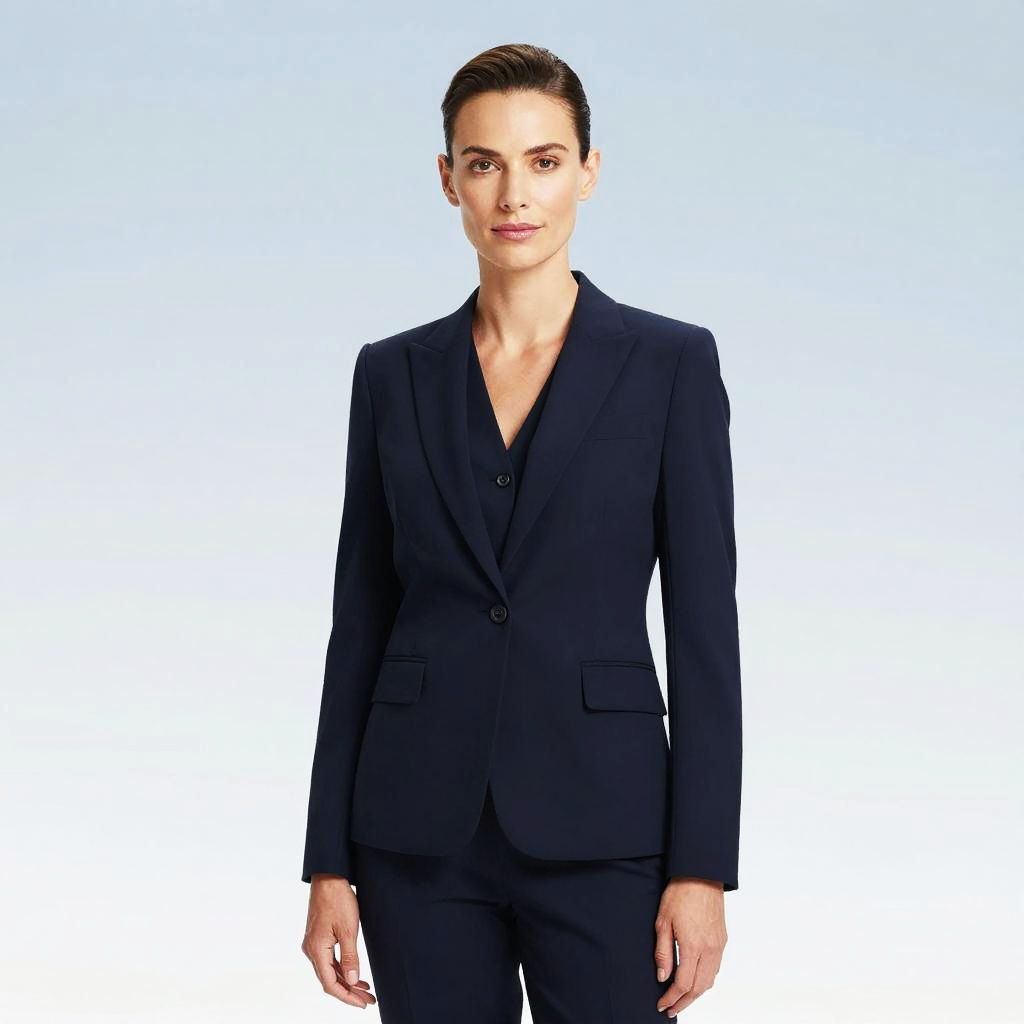 Adult woman, Tall and Slim, Straight Bob, kelsey plum outfit, navy blazer, white blouse, tailored pants, black pumps, professional elegance