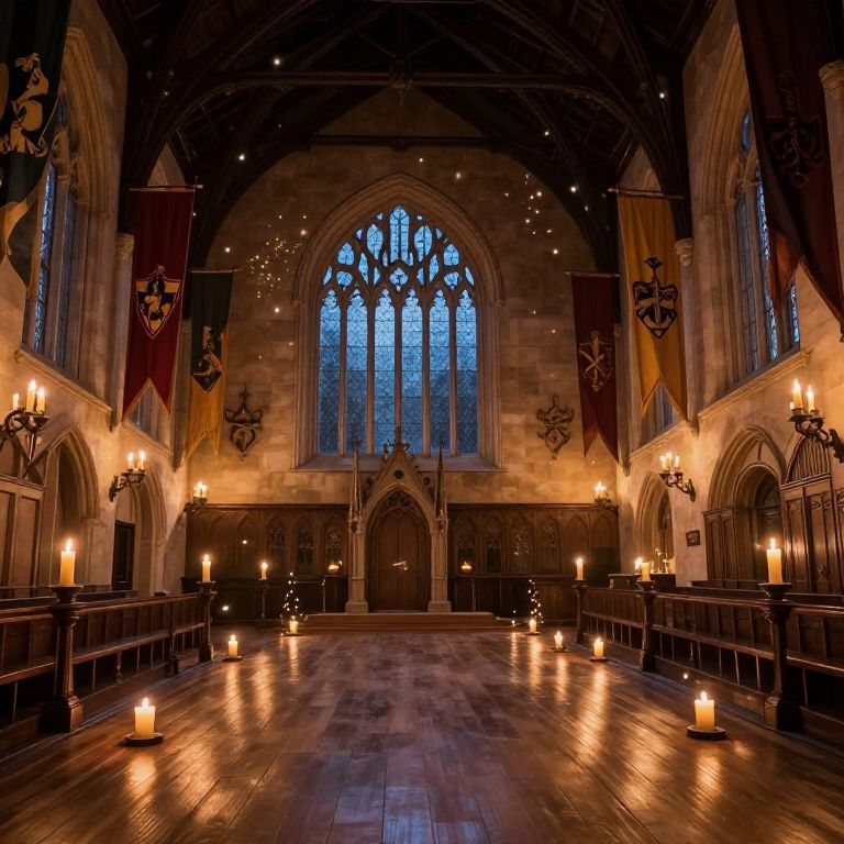 Hogwarts Grand Hall at twilight, glowing candles floating above, polished wooden floors, majestic arched windows, house banners flowing, magical atmosphere with soft glowing spells, detailed and enchanting.
