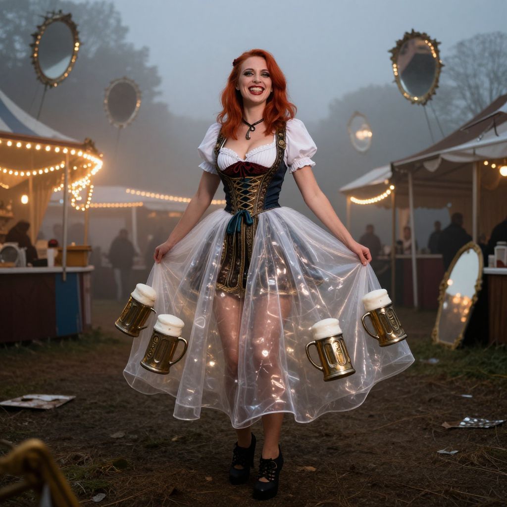 An edgy, surreal alternative Oktoberfest costume combining a floating, translucent gown with metallic beer mug decorations, worn by a slender woman with bright red hair, high cheekbones, and a wide, mischievous grin, set against a foggy, abandoned Oktoberfest fairground with flickering fairy lights and distorted mirrors.. The woman has big tits and cute face