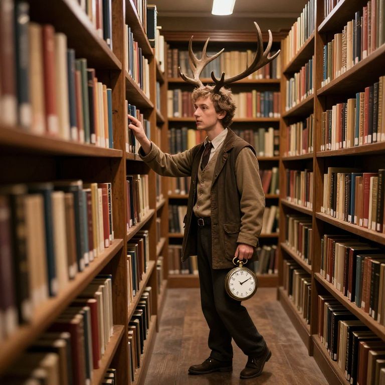 A librarian with antlers and a pocket watch combs through a never-ending bookshelf, whispering titles that rewrite history while he walks.