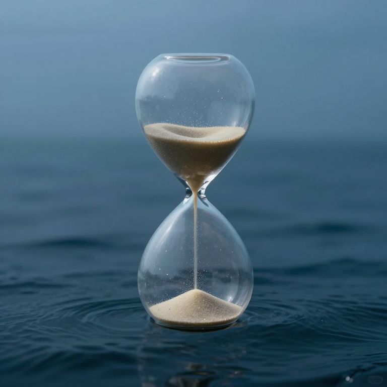 Photograph of a clear glass hourglass with two bulbous sections, standing on a dark blue, rippled surface. The hourglass contains a small amount of beige sand in the upper bulb, with more sand accumulating in the lower bulb. The background is a gradient of blue, creating a tranquil, oceanic atmosphere. The glass is transparent, showcasing subtle reflections and the texture of the sand. The image emphasizes the passage of time, with a calm, minimalist aesthetic.