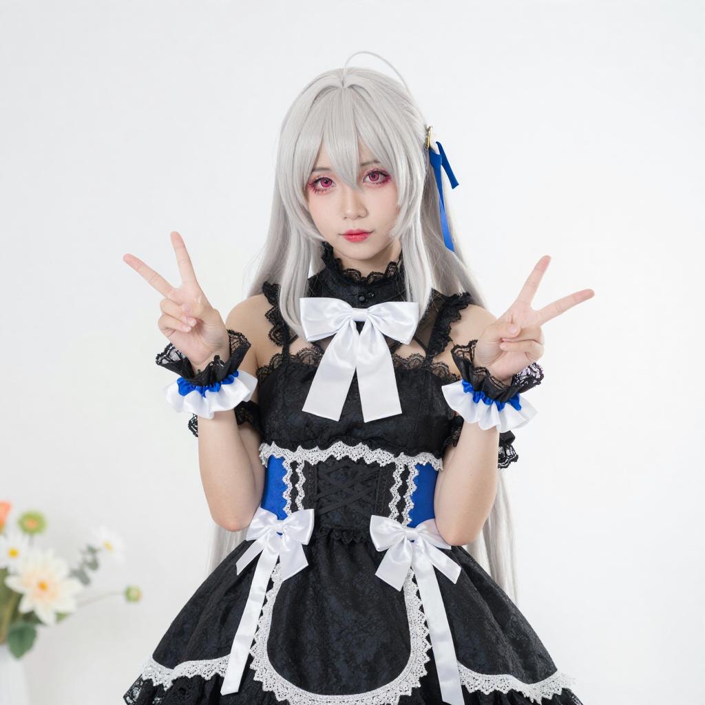 Photograph of a young woman in a detailed cosplay outfit. She has silver hair with blue bows, wearing a black and blue dress with lace and ribbon details. She holds her finger to her lips, with white cherry blossoms in the background and a window to the right. Her makeup is pink and delicate, matching her innocent expression.