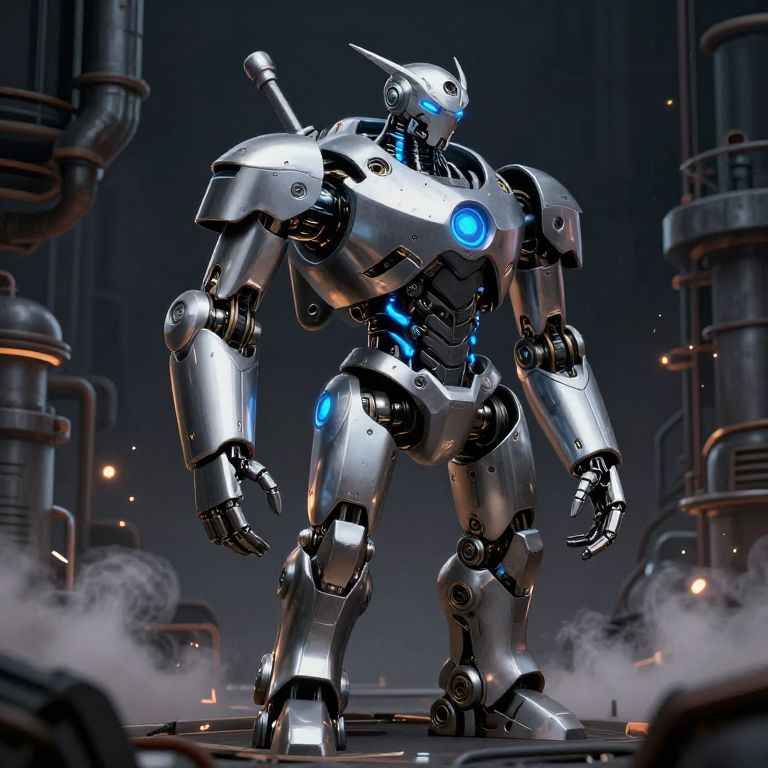 Grouchy Rusted Robot in Cyberpunk Factory