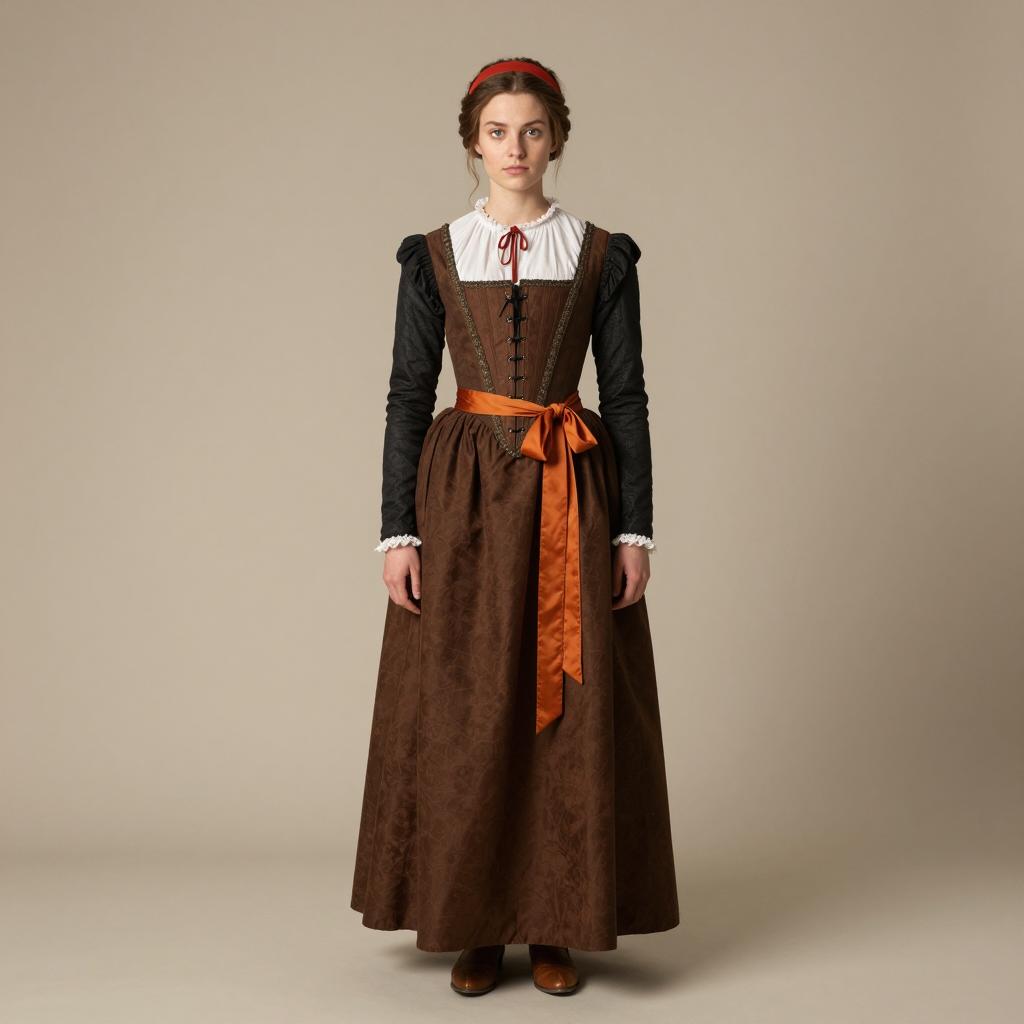 Catherine medici costume, photograph of a young woman, standing, full body, wearing historical Renaissance costume, brown dress with corset lacing, white lace-trimmed blouse, black long-sleeve overdress, orange ribbon belt, brown boots, red headband, brown hair, serious expression, plain beige background, studio lighting, realistic, detailed ures, historical fashion, vintage style, medium shot, center alignment, standing pose
