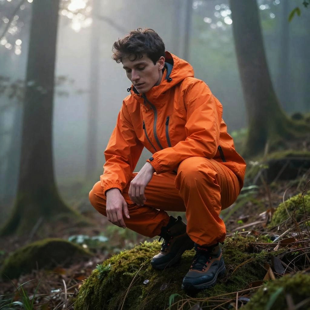 Guy in orange jumpsuit crouched in a forest clearing at dawn, mist swirling around, sharp focus on the figure, vibrant colors, atmospheric nature scene