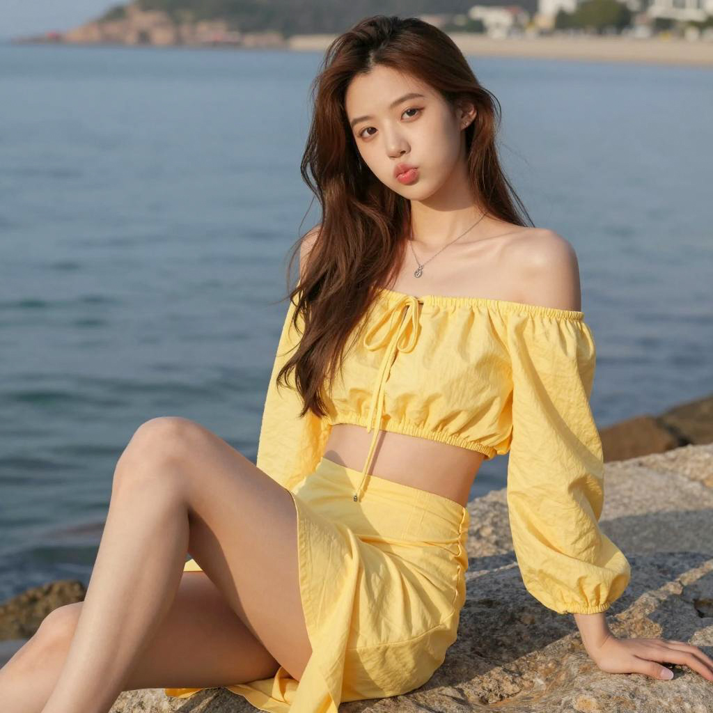 A young woman with braided hair wearing an orange swimsuit standing on a sandy beach with sparse green bushes in the background under a bright blue sky with soft white clouds, natural lighting, warm tones, candid and relaxed summer beach atmosphere