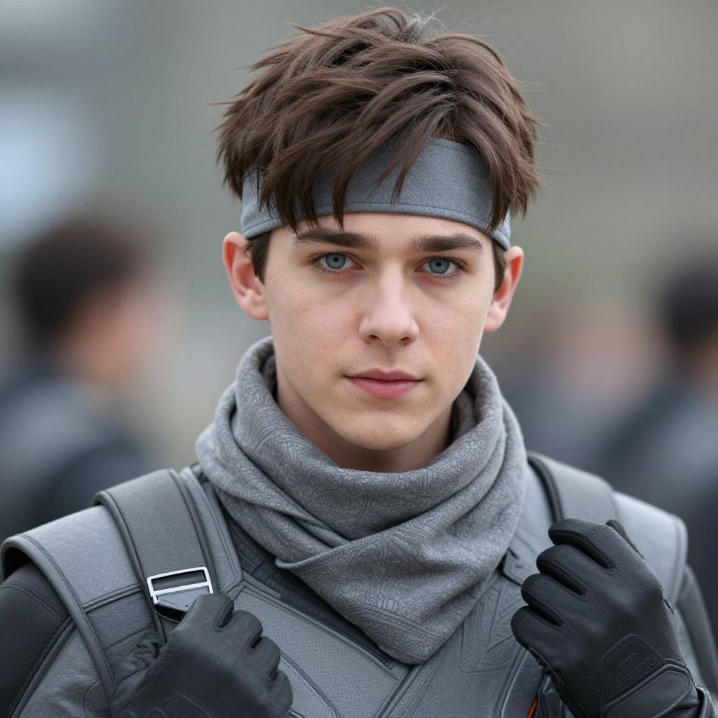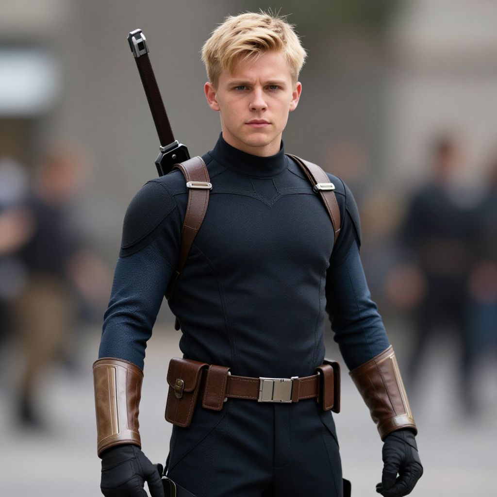 Hawkeye superhero costume, 1boy, male focus, solo, blonde hair, realistic, weapon, blurry background, blurry, belt, looking at viewer