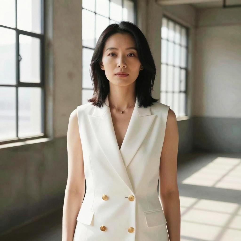 Photograph of an Asian woman with shoulder-length black hair, standing in a sunlit, industrial-style room with large windows. She's wearing a sleeveless, white double-breasted blazer with gold buttons, and a delicate necklace. The room has concrete walls and a slightly worn look, with sunlight creating soft shadows. She has a calm, confident expression.