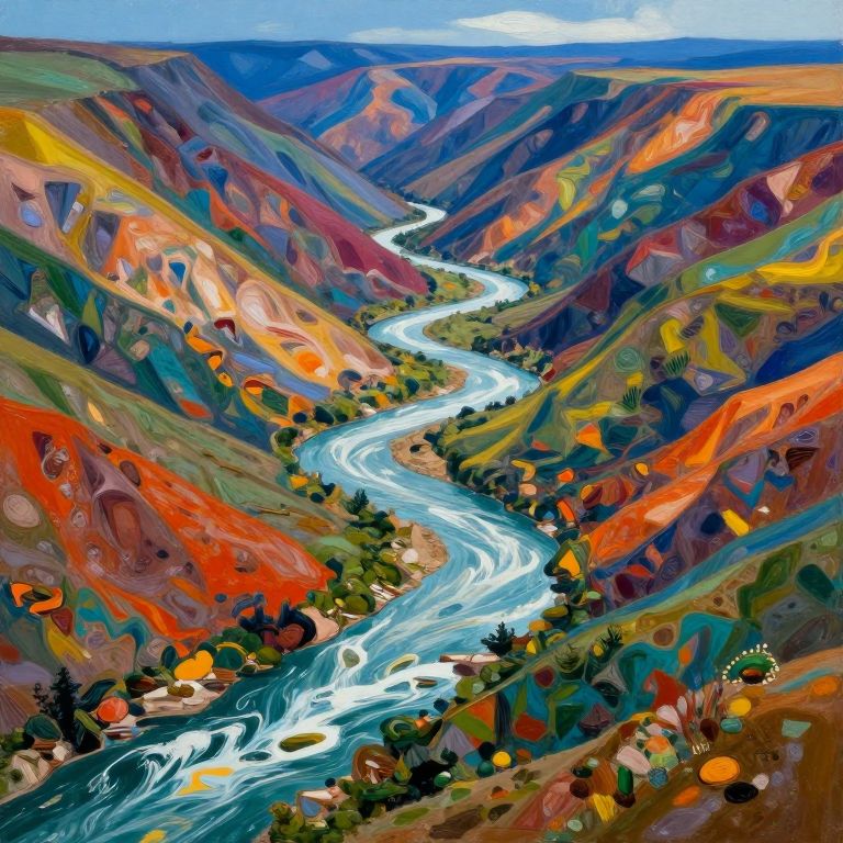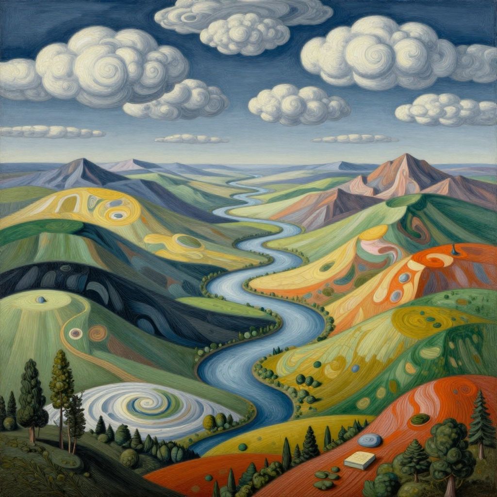 Rivers of liquid color flow uphill, defying gravity by painting new landscapes along their path that dissolve and regenerate in an endless artistic cycle.