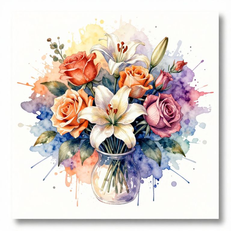 The image presents a beautifully detailed watercolor illustration of a bouquet of flowers, set against a vibrant, abstract watercolor splash background. The flowers, including roses and lilies, are depicted with intricate line work and shading, creating a sense of depth and realism. The bouquet is centrally composed, with the flowers arranged in a vase that is partially visible at the bottom. The watercolor splashes in shades of orange, yellow, blue, and purple add a dynamic and artistic touch to the scene, enhancing the overall visual appeal. The illustration employs both fugitive and non-fugitive paints, ensuring lightfastness and longevity. An embedded watermark is subtly present, indicating the artist's signature or ownership. The image is framed within a simple, white background, allowing the colorful bouquet and abstract background to stand out prominently.