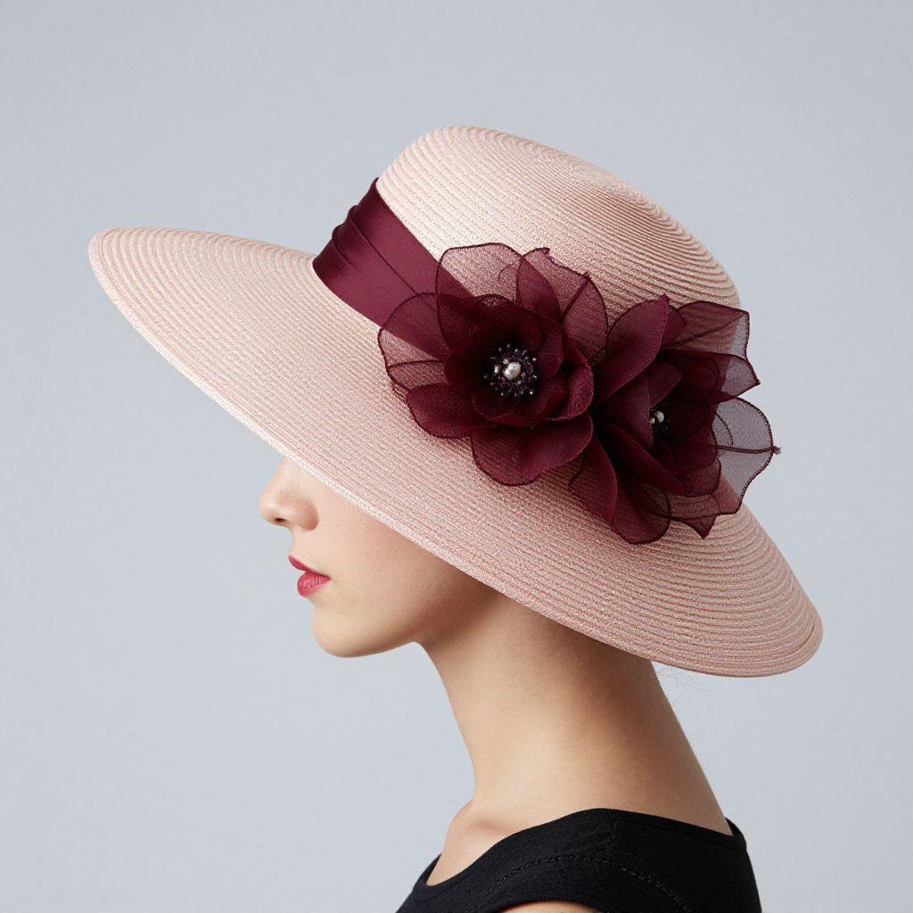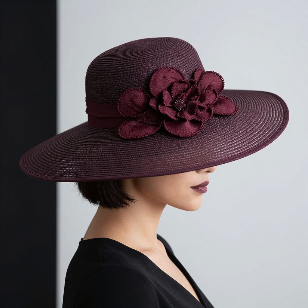 Elegant profile of a woman wearing a wide-brimmed hat adorned with a maroon floral embellishment, crafted by Janet Taylor Millinery, set against a minimalist background.