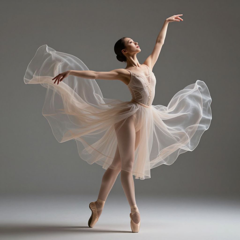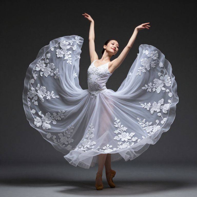 Transparent white dress with intricate floral embroidery, worn by a graceful dancer mid-spin, studio backdrop with dramatic lighting highlighting fabric transparency and movement