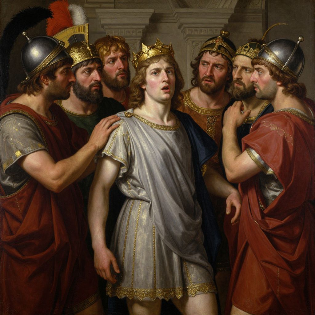 The painting vividly captures the dramatic events of Mithridates VI's betrayal by his own son, highlighting the tension between loyalty and treachery. The central figure, a young man with long, wavy hair adorned with a golden crown, stands prominently in the foreground, his expression one of intense emotion. Surrounding him are several men, each wearing elaborate helmets and robes, their faces etched with varying degrees of concern and suspicion. The colors are rich and earthy, with deep reds and golds dominating the palette, creating a sense of grandeur and drama. The spatial relationships are tightly composed, with the figures arranged in a semi-circle, drawing the viewer's eye towards the central figure. The interplay of light and shadow adds depth and dimension to the scene, emphasizing the emotional weight of the moment. The overall composition is dynamic, with the figures' postures and gazes converging on the central figure, creating a focal point that draws the viewer into the narrative of betrayal and treachery.