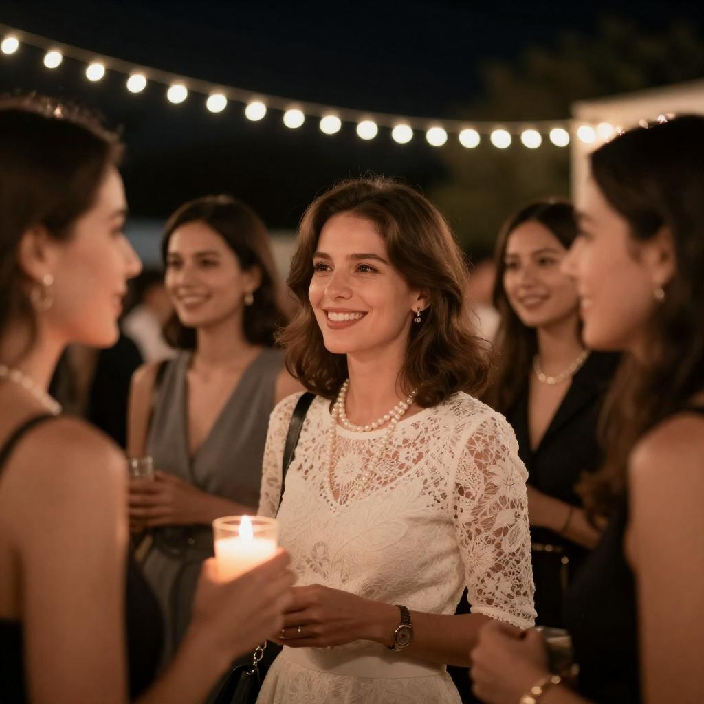 Photograph of a group of elegantly dressed women at a nighttime event, illuminated by warm, glowing string lights in the background. The central woman with shoulder-length brown hair, wearing a white lace dress and pearl necklace, smiles while holding a lit candle. Other women, also in formal attire, are partially visible, smiling and engaged in conversation.