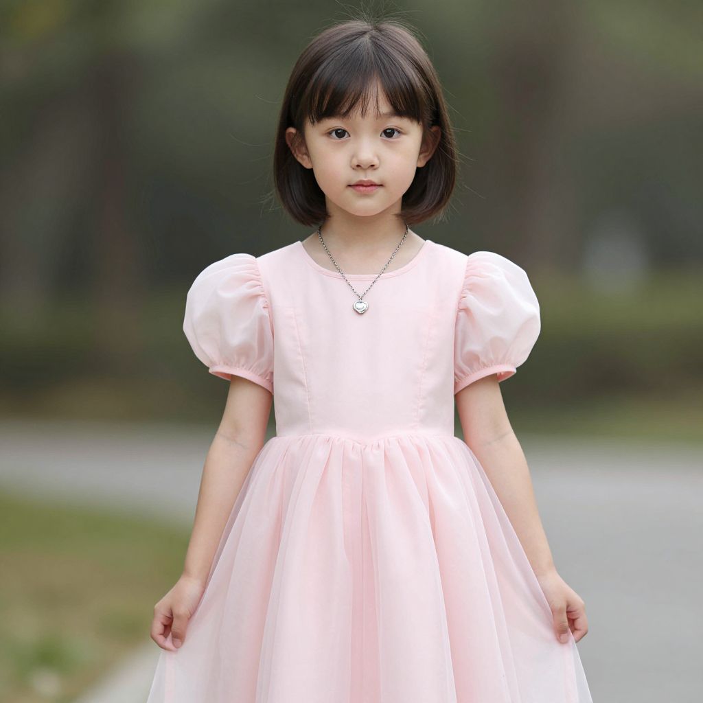 Photograph of an Asian young girl standing outdoors. She has straight, black, shoulder-length hair with bangs, and large, dark eyes. She wears a pastel pink, short-sleeved, puffy-sleeve dress with a full, flowing skirt, and a delicate silver necklace. The background is blurred with greenery and a pathway, suggesting a park or garden setting. Her expression is neutral, and she stands with her hands gently by her sides. The lighting is natural, highlighting the softness of her dress and the smoothness of her skin.