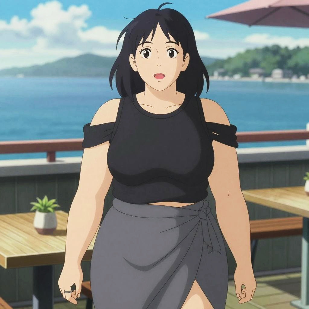 A Plus-size woman in a casual chic black cut-out shoulder top and a gray wrap skirt stands on the deck with seating by the ocean, embodying the vibrant and colorful visual style of Kyoto Animation. She accessorizes with a silver ring, enjoying the serene seaside atmosphere. Sexy. Pretty face and beutiful eyes